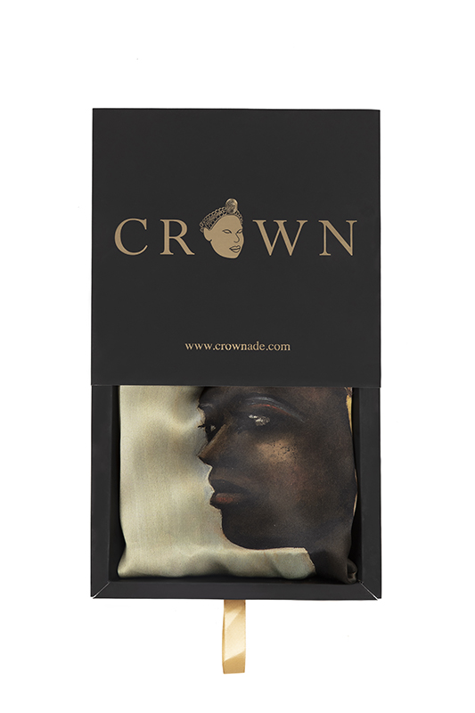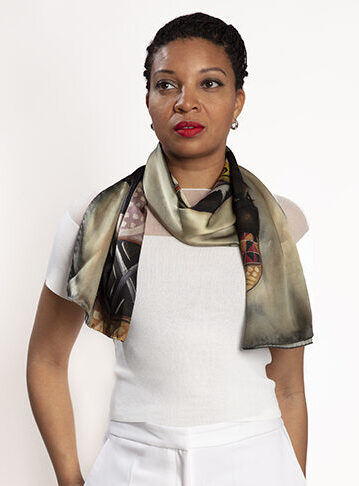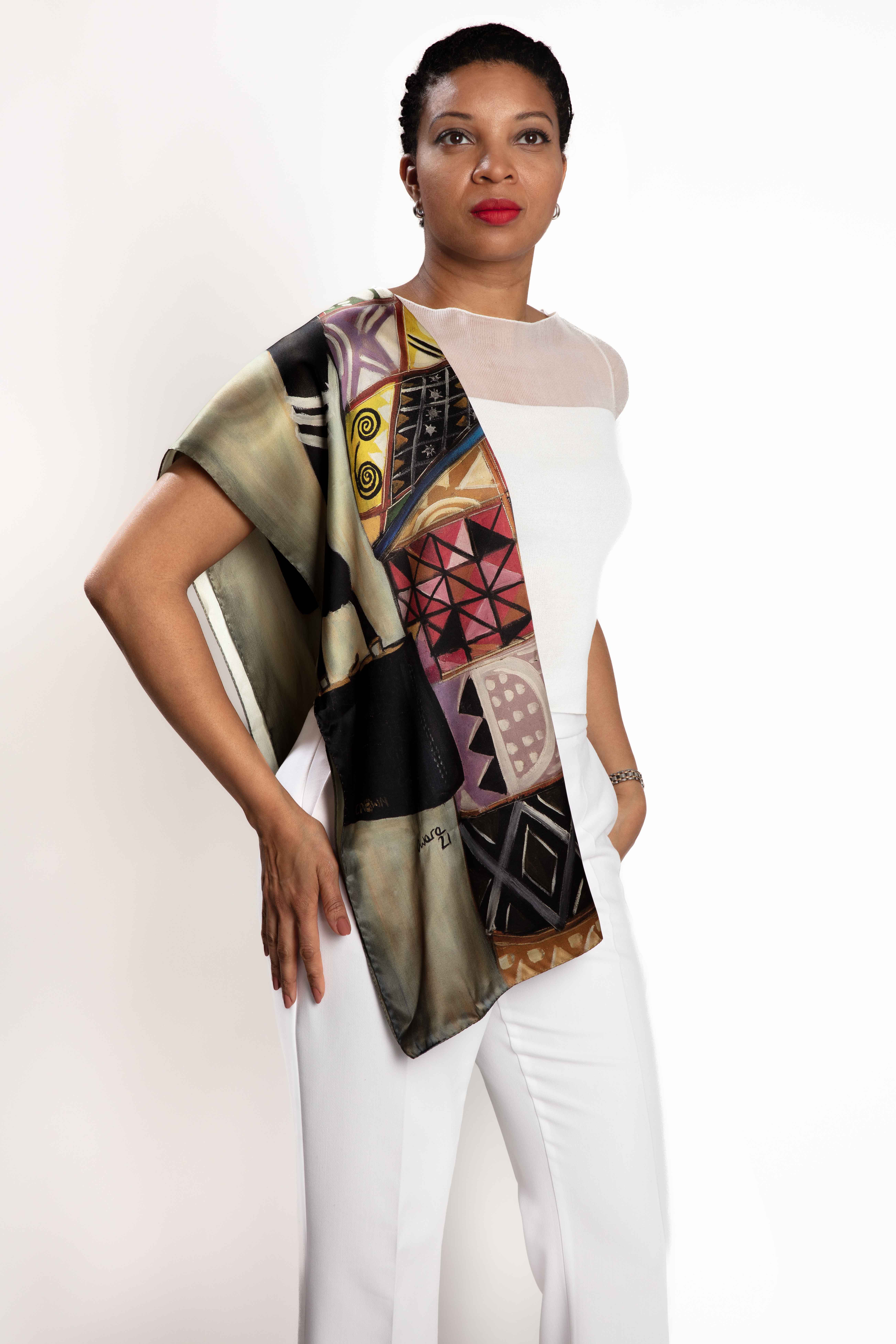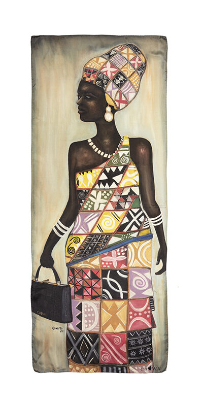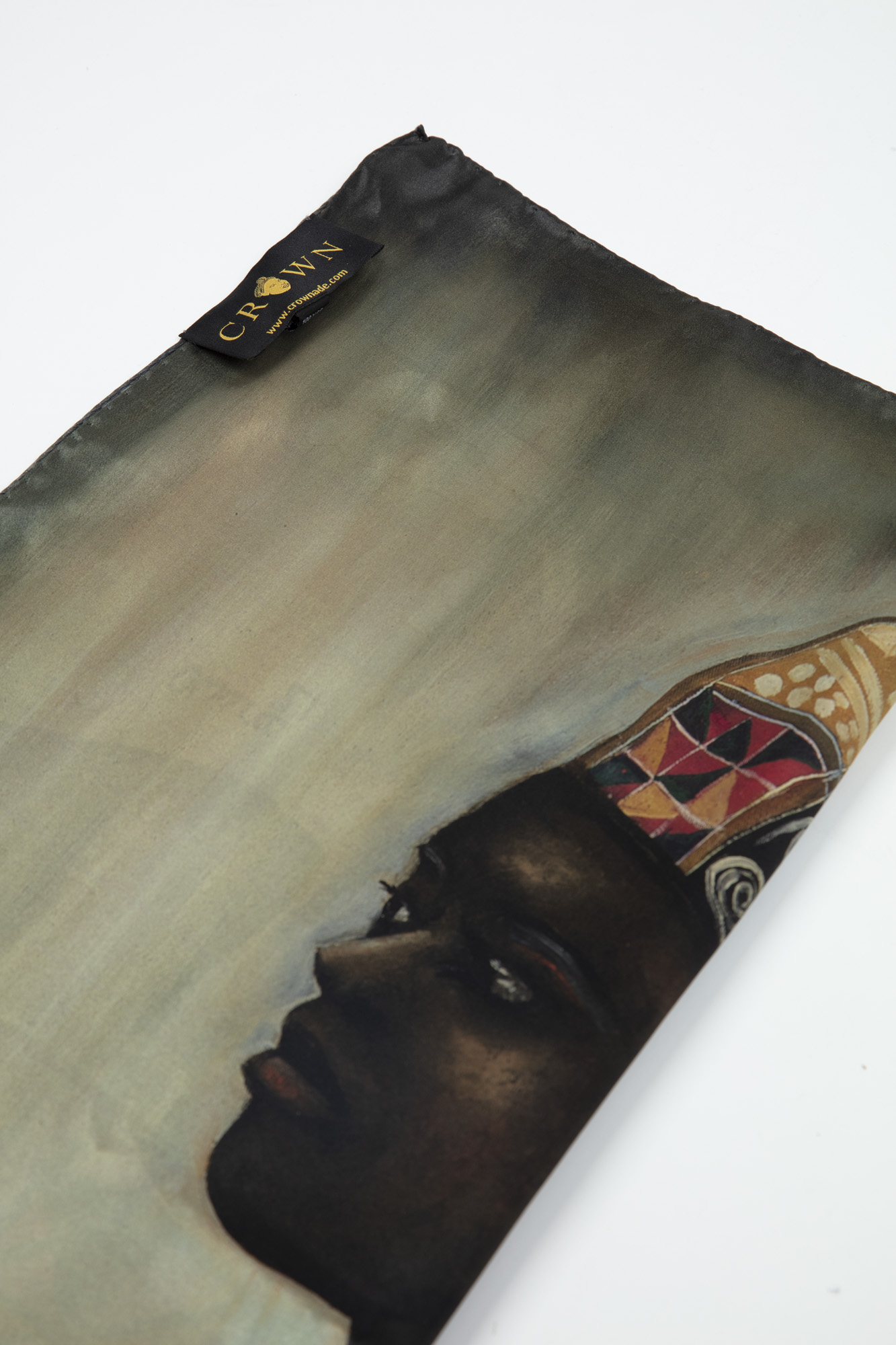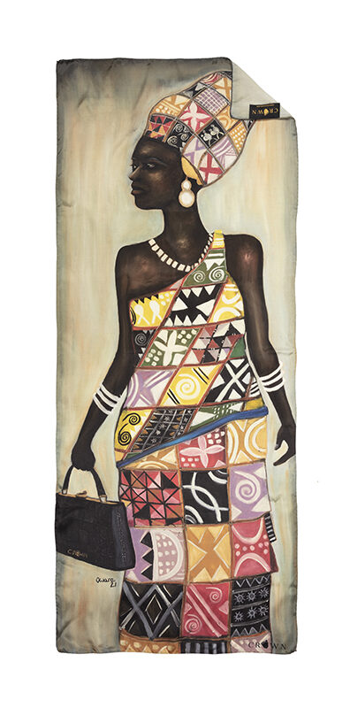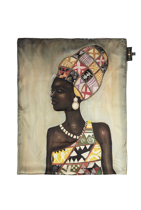 A true piece of art! This luxury scarf elevates your appearance instantly! Wear it around your neck, your shoulders or as a head scarf. The depicted artwork is custom made in Nigeria for CROWN and printed onto the scarves. The lady in the artwork holds our lovely AdeOshun black handbag and is dressed in Adire.